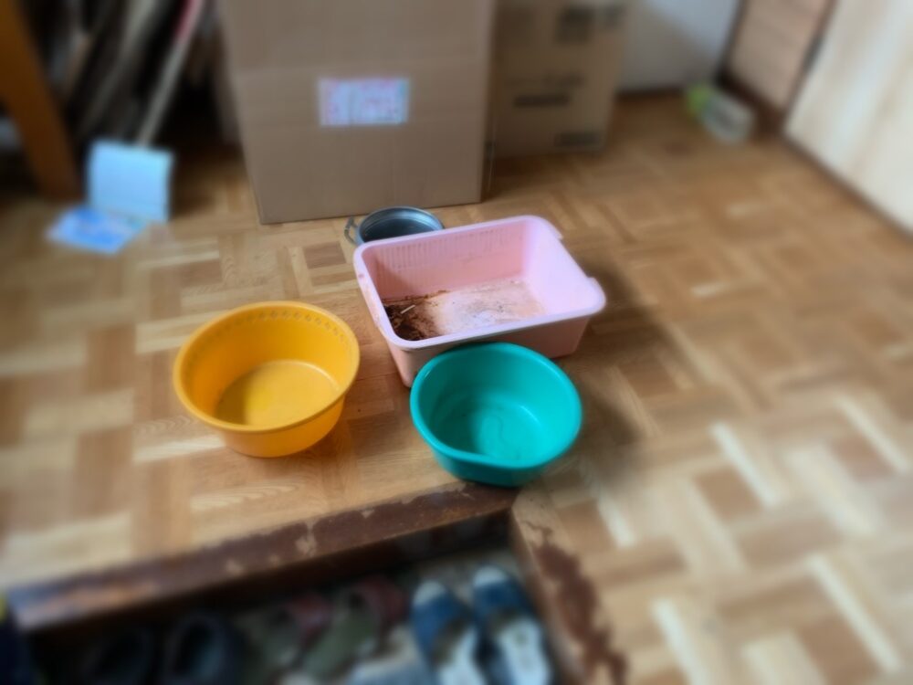 また、スガ漏れが酷く水滴が2階の天井から1階の玄関まで落ちてきていたのでその水滴が落ちている箇所5~6か所の下にバケツやタライなどを置いておき被害が広がらないようにしてきました。