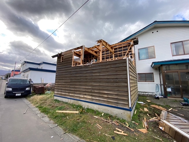 もう数年で住まなくなく予定のお宅の物置が「毎年雪が車道に落ちて人や車に当たらないか心配だし、落ちたら落ちたで除雪しないといけないしで大変なので物置自体を撤去したい」というご相談でした。