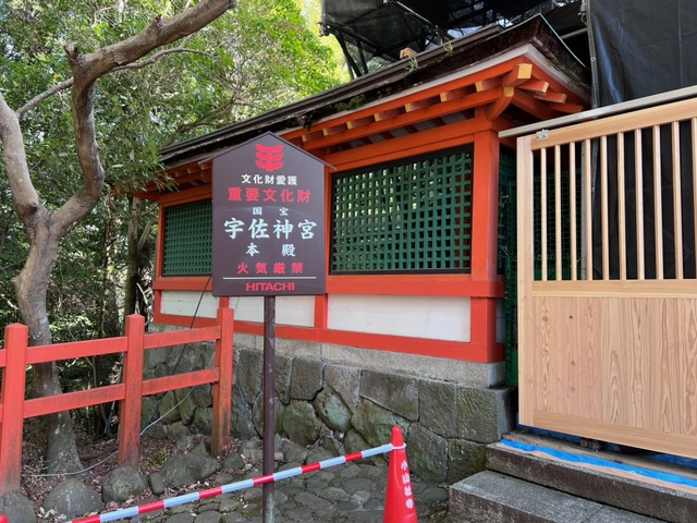 有形文化財の「宇佐鳥居」をくぐり同じく有形文化財の「西大門」が工事中でした(;^_^A