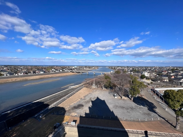 城の展望台からは中津川と遠くに海(周防灘)が見えます。