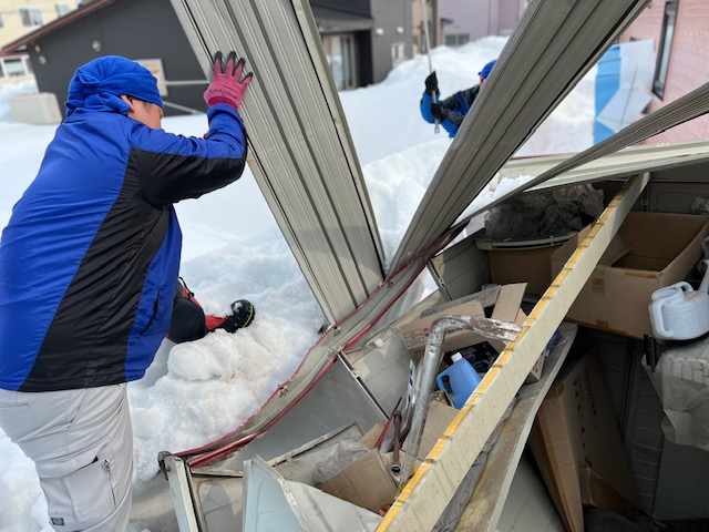 下記写真のように物置が雪の重みでひしゃげてしまったので解体して欲しいというご依頼です。