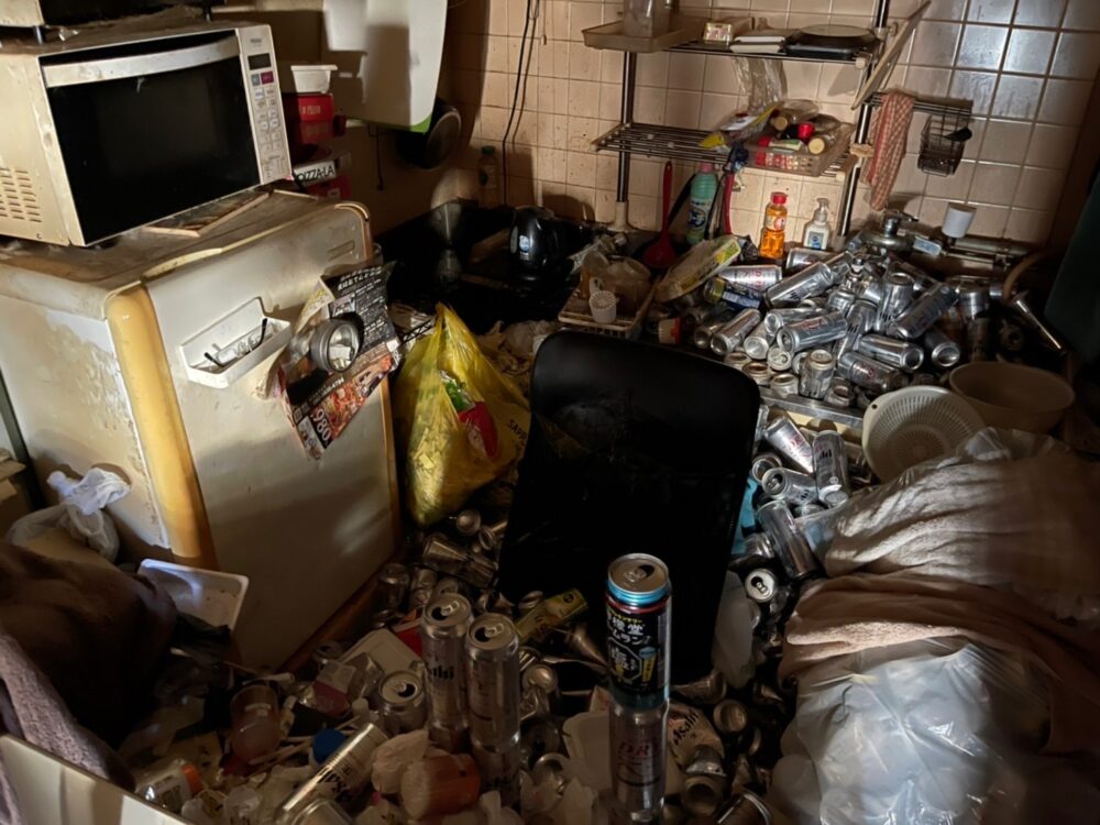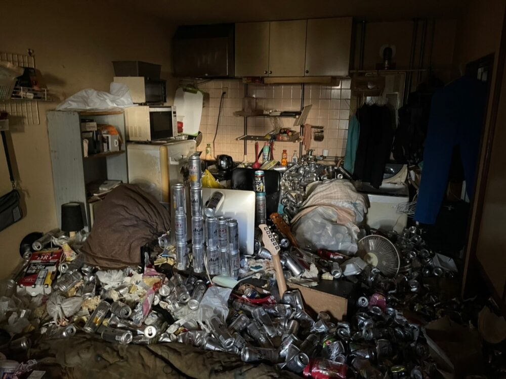 室内はビールや缶酎ハイでびっしりのゴミ部屋・・・。