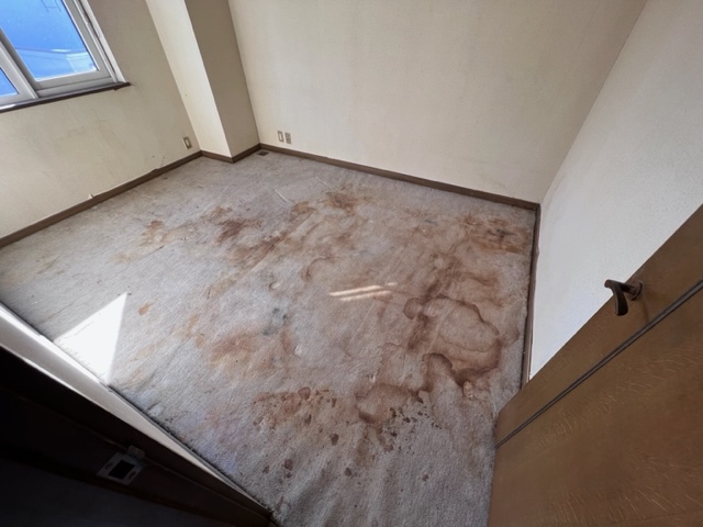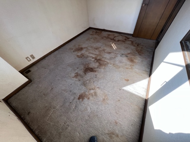 ゴミを廃棄してカーペットを避けた後もおしっこの染みなのか床が汚れていました・・・。