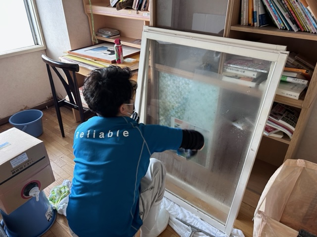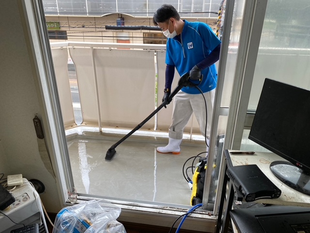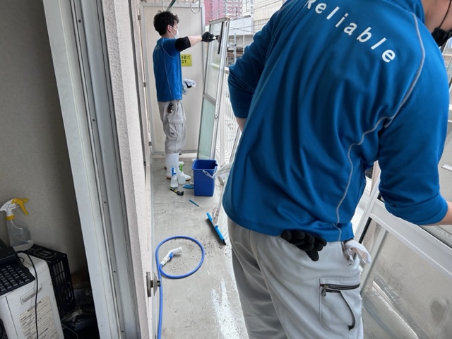 最終日は高圧洗浄機を使用してベランダの清掃、各ガラス窓、サン、スイッチや扉などの建具を清掃を行います。